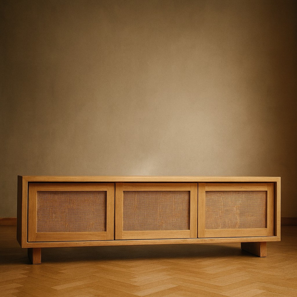 Enhance your living space with the Nai TV Unit, crafted from ash wood veneer and natural rattan. This sleek, wall-mountable unit features three compartments and discreet wire holes for a tidy setup. Ideal for contemporary homes that prioritize both aesthetics and practicality. --
