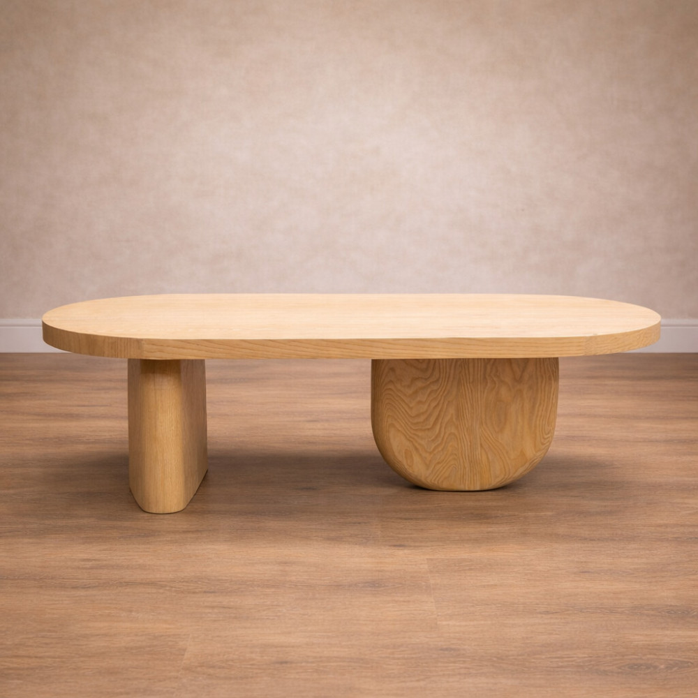 The Nivra Table balances a broad, rounded top with sculpted solid wood bases, creating a grounded yet fluid form. Its quiet presence anchors living spaces with warmth and architectural calm.