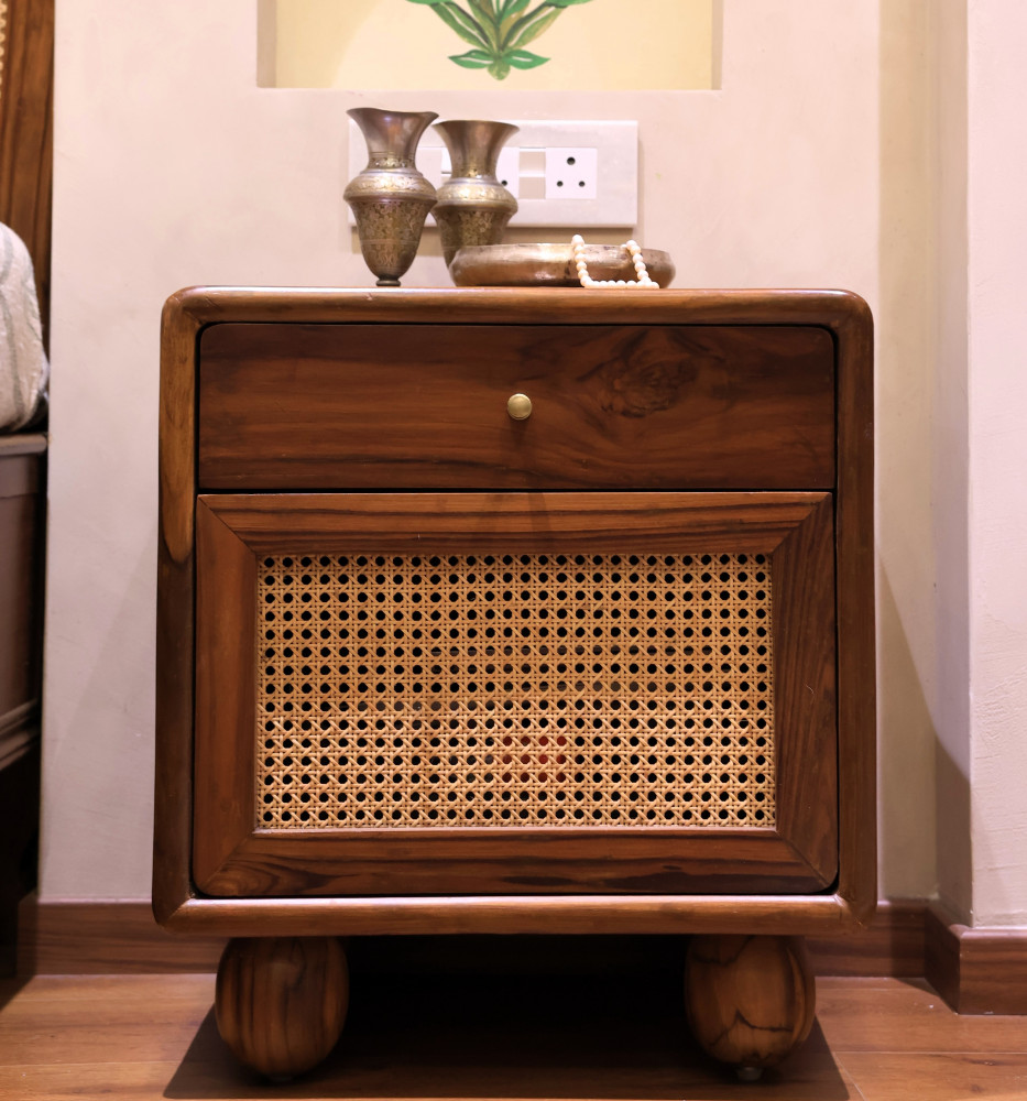 A bedside that steals the spotlight. Crafted in solid wood with handwoven cane, rounded edges, and bold ball legs, the Sol Table balances warmth with style. A drawer and roomy cabinet make it as functional as it is beautiful.
